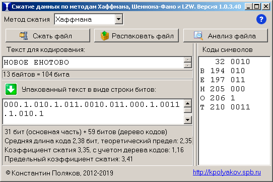 алгоритмов Хаффмана, Шеннона-Фано и LZW строки текста, а также файлы любого формата.