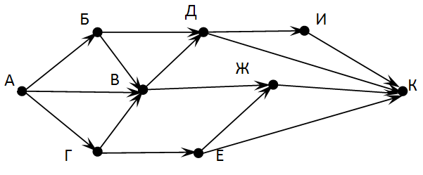 10. На рисунке - схема дорог, связывающих города А, Б, В, Г, Д, Е, Ж, З, И, К. По каждой дороге можно двигаться только в одном направлении, указанном стрелкой. Сколько существует различных путей из города А в город К?