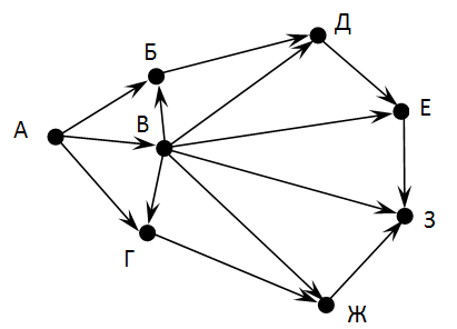 9. На рисунке - схема дорог, связывающих города А, Б, В, Г, Д, Е, Ж, З. По каждой дороге можно двигаться только в одном направлении, указанном стрелкой. Сколько существует различных путей из города А в город З?