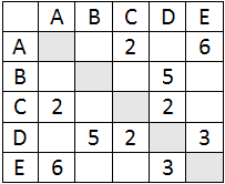 11. На рисунке приведена весовая матрица графа, в которой веса обозначают расстояния между соседними пунктами. Определите длину маршрута E-D-C-A.
