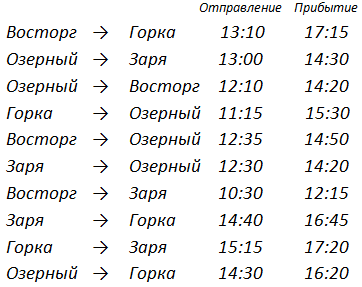 2. Между четырьмя местными аэропортами: ВОСТОРГ, ЗАРЯ, ОЗЕРНЫЙ и ГОРКА, ежедневно выполняются авиарейсы. На рисунке приведён фрагмент расписания перелётов между ними. Путешественник оказался в аэропорту ВОСТОРГ в полночь (0:00). Определите самое раннее время, когда он может попасть в аэропорт ГОРКА.