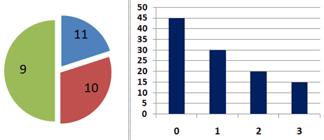 6. Все ученики старших классов (с 9-го по 11-й) участвовали в школьной спартакиаде. По результатам соревнований каждый из них получил от 0 до 3 баллов. На первой диаграмме показано количество по классам, а на второй — количество учеников, набравших баллы от 0 до 3. Какое из утверждений следует из анализа обеих диаграмм?