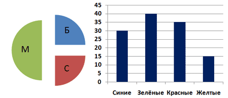 7. В магазине продаются мячи четырех цветов (синие, зелёные, красные и жёлтые) и трех размеров: большие (Б), средние (С) и маленькие (М). На первой диаграмме показано количество мячей разного размера, а на второй — распределение мячей по цветам. Какое из утверждений следует из анализа обеих диаграмм?