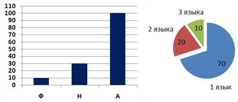 8. На предприятии работают 100 человек. Каждый из них владеет по крайней мере одним иностранным языком. Первая диаграмма показывает, сколько человек владеют каждым из языков (А — английский, Н — немецкий, Ф — французский). Вторая диаграмма отражает количество человек, знающих только один язык, два языка или три языка. Определите, сколько сотрудников владеют английским и немецким, но не говорят по-французски.