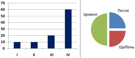 10. Фирма продает стройматериалы — цемент, песок, щебень. объемы продаж измеряются в кубометрах. На первой диаграмме показаны суммарные продажи по всем трем типам стройматериалов, а на второй — годовое распределение объема продаж по стройматериалам. Какие из этих утверждений ПРОТИВОРЕЧАТ информации, показанной на диаграммах?