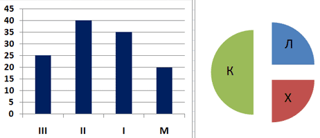 5. В соревнованиях по зимним видам спорта принимают участие лыжники (Л), конькобежцы (К) и хоккеисты (X). Спортсмены имеют разный уровень мастерства: каждый имеет либо III, либо II, либо I разряд, либо является мастером спорта (М). На первой диаграмме отражено количество спортсменов с различным уровнем спортивного мастерства, а на второй — распределение спортсменов по видам спорта. Какие из этих утверждений следуют из анализа обеих представленных диаграмм?