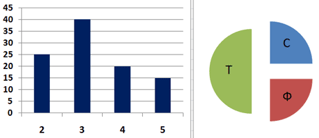 4. В цехе трудятся рабочие трех специальностей - токари (Т), слесари (С) и фрезеровщики (Ф). Каждый рабочий имеет разряд не меньший второго и не больший пятого. На диаграмме I отражено количество рабочих с различными разрядами, а на диаграмме II - распределение рабочих по специальностям. Каждый рабочий имеет только одну специальность и один разряд. Какое из утверждений следует из анализа обеих диаграмм?