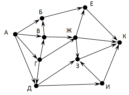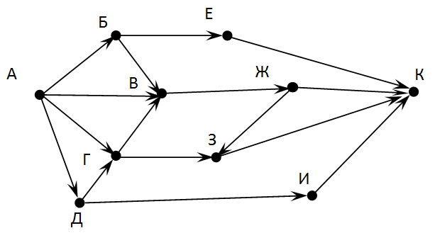 4. На рисунке - схема дорог, связывающих города А, Б, В, Г, Д, Е, Ж, З, И, К. По каждой дороге можно двигаться только в одном направлении, указанном стрелкой. Сколько существует различных путей из города А в город К?