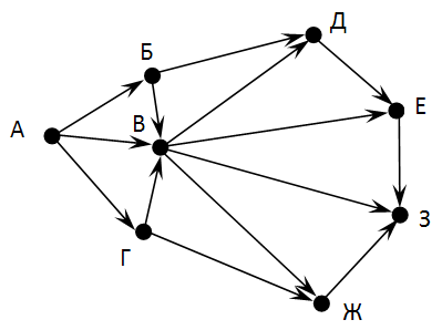2. На рисунке - схема дорог, связывающих города А, Б, В, Г, Д, Е, Ж, З. По каждой дороге можно двигаться только в одном направлении, указанном стрелкой. Сколько существует различных путей из города А в город З?