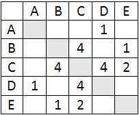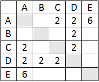 10. На рисунке приведена весовая матрица графа, в которой веса обозначают расстояния между соседними пунктами. Определите длину маршрута D-B-E-C-A.