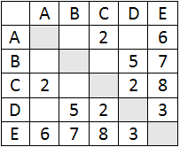 8. Между населёнными пунктами A, B, C, D, E построены дороги, стоимость перевозки по которым приведена в таблице. (Отсутствие числа в таблице означает, что прямой дороги между пунктами нет). Определите