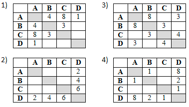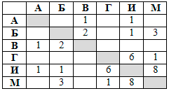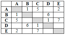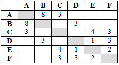 5. Между населёнными пунктами A, B, C, D, E, F построены дороги, протяжённость которых (в километрах) приведена в таблице. Определите длину кратчайшего пути между пунктами A и D. Передвигаться можно только по дорогам, протяжённость которых указана в таблице. |